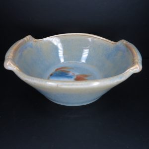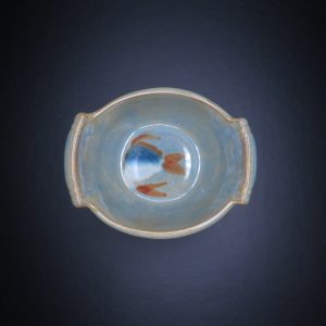 Light blue-green in color with a golden brown rim and handles. The inside of the bowl features a painted design of a fish, in shades of orange and blue. Signed by unknown artist. 4¾ inches long, 3½ inches wide, 1½ inches tall.