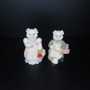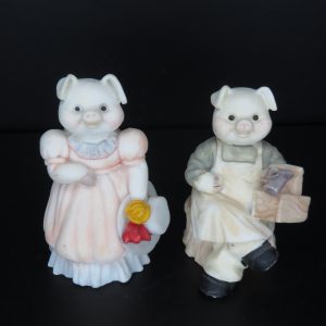 Hand-painted in 1991. Boy pig sitting down crossing his legs, holding a toolbox. Girl pig in pink dress holding her floral hat. 2¼ inches tall.