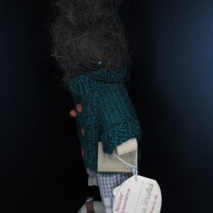 Handcrafted by Valerie Shustack. A girl doll in a green knit sweater wearing glasses. Ladie and Friends, Inc. 1995. 12 inches tall.