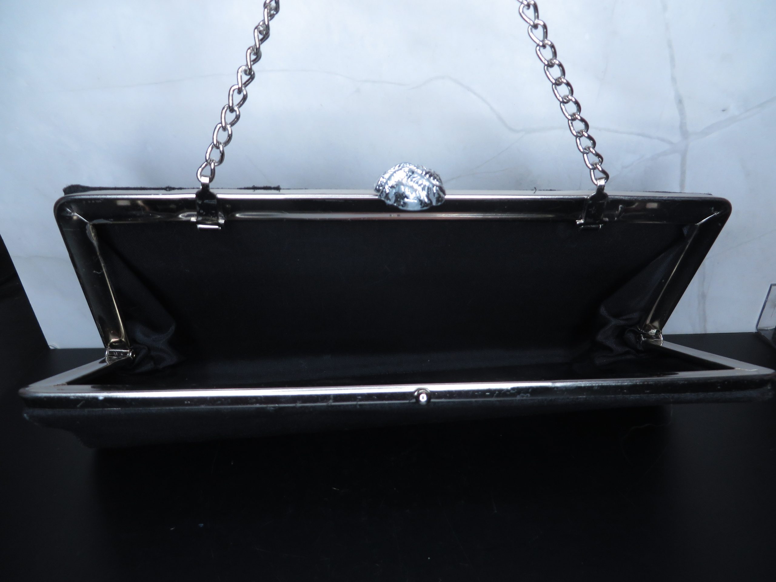 Ornate clasp, silver tone chain. 10 inches wide, 5 inches tall.