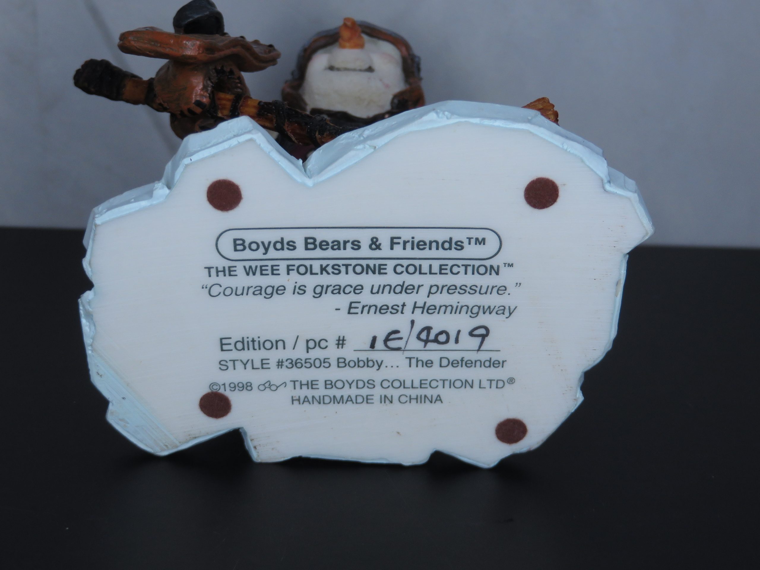 The Wee Folkstone Collection, “Courage is grace under pressure” -Ernest Hemingway. Edition / pc # 1E/4019 Style #36505. 1998. 3½ inches tall and wide.