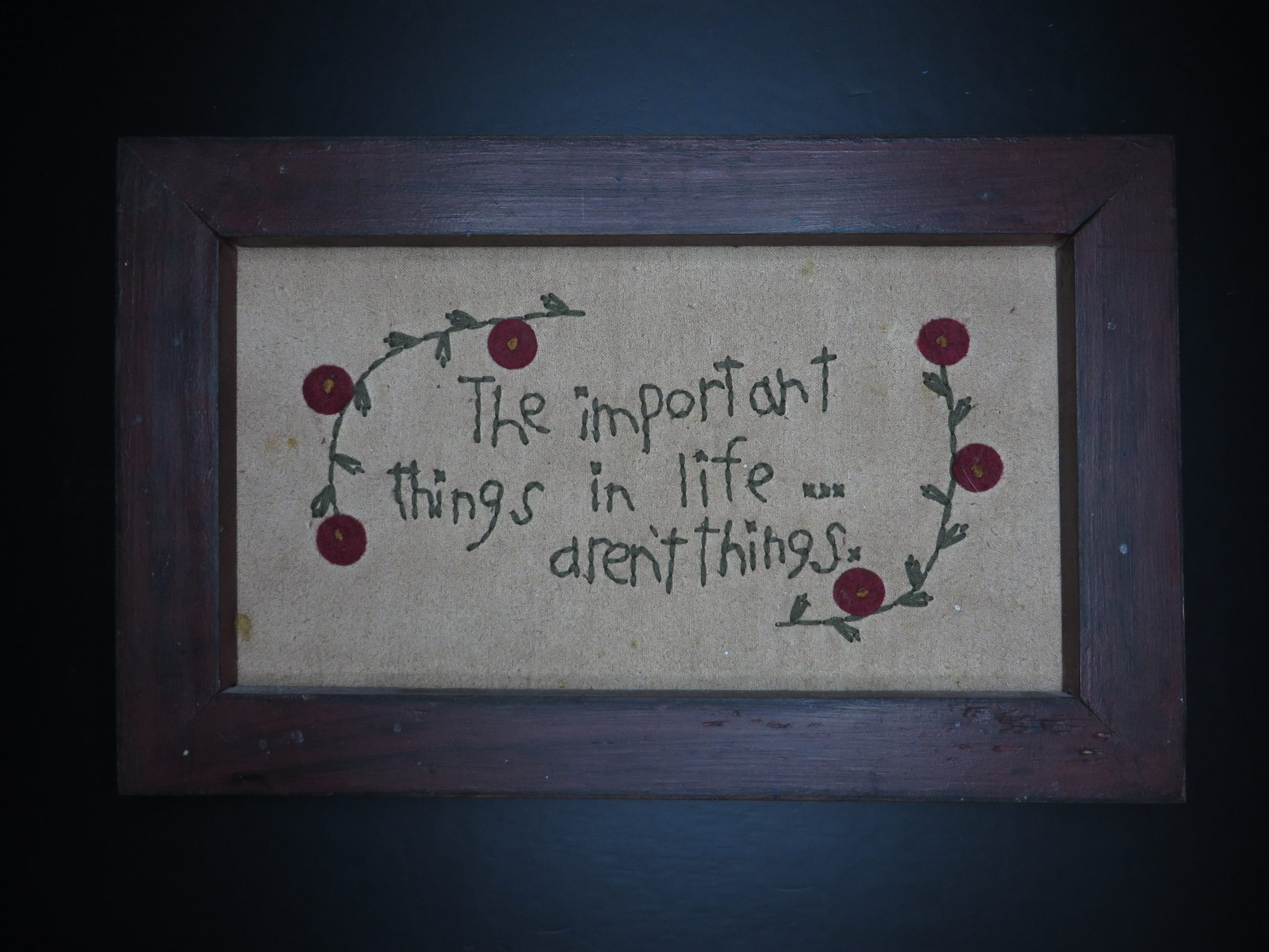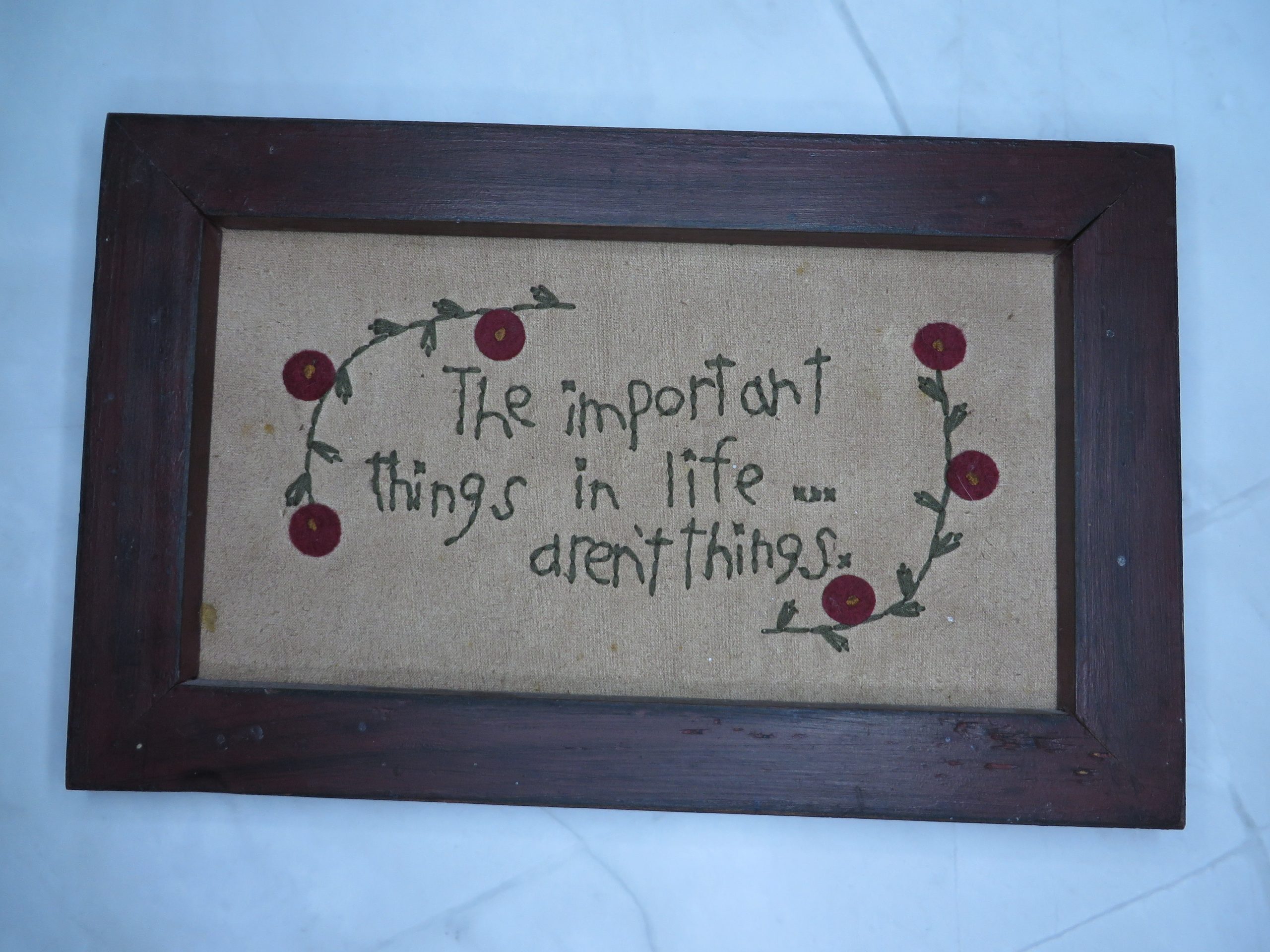 “The important things in life… aren’t things.” With floral designs. 10½ inches by 6½ inches.