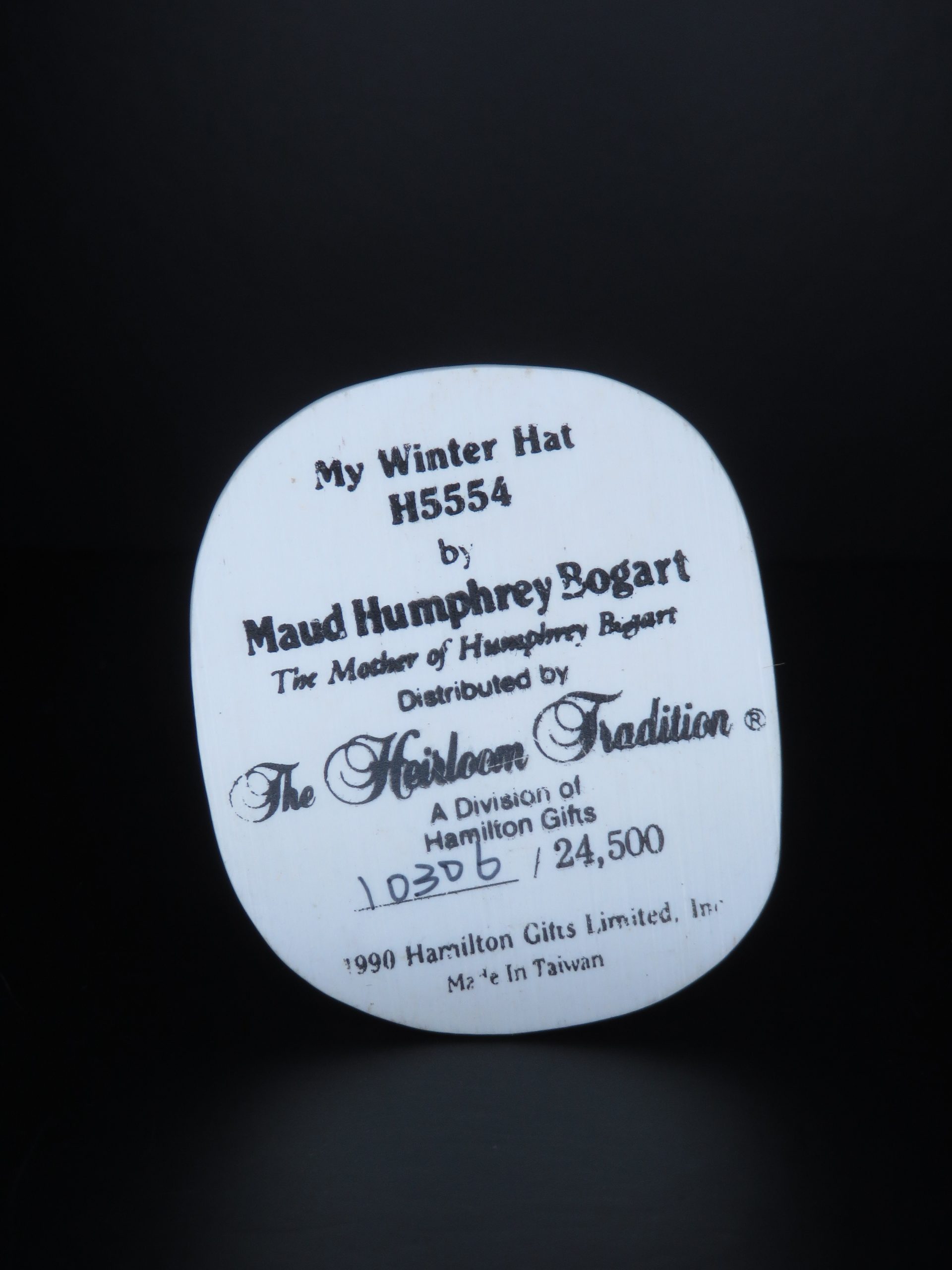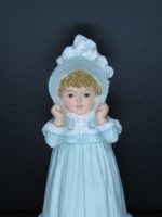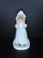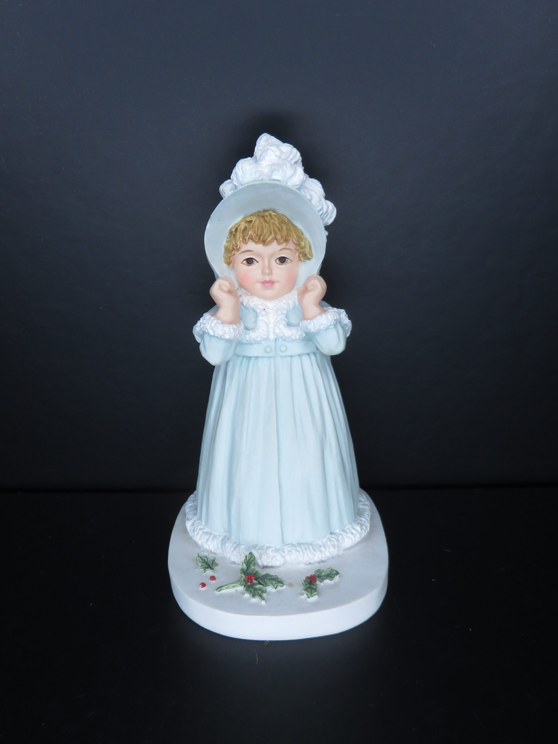 “My Winter Hat” H5554 by Maud Humphrey Bogart. The Mother of Humphrey Bogart. Distributed by The Heirloom Tradition. A division of Hamilton Gifts 10306/24,500. 1990 Hamilton Gifts Limited, Inc. Made in Taiwan. Little girl in light blue dress and light blue hat with fur design along with Christmas holly on the ground. 4½ inches.