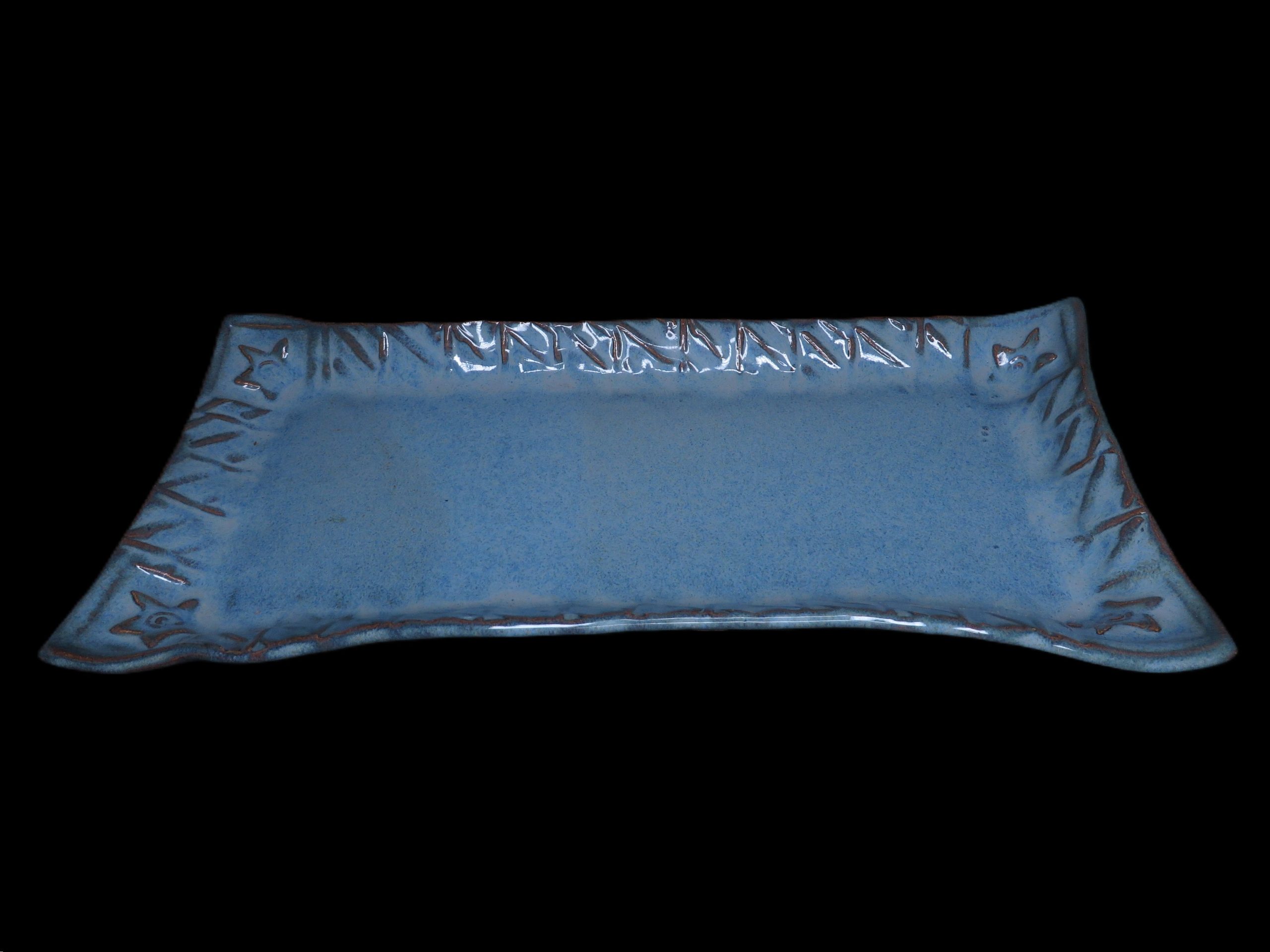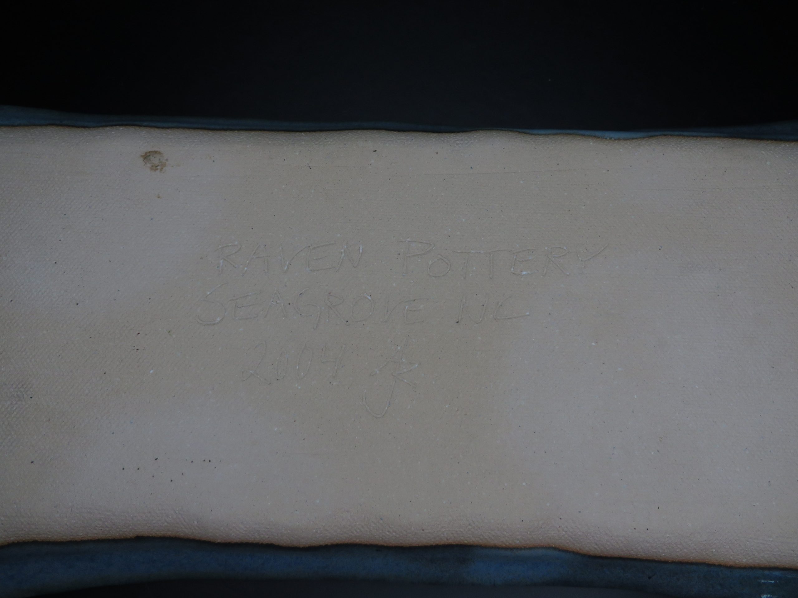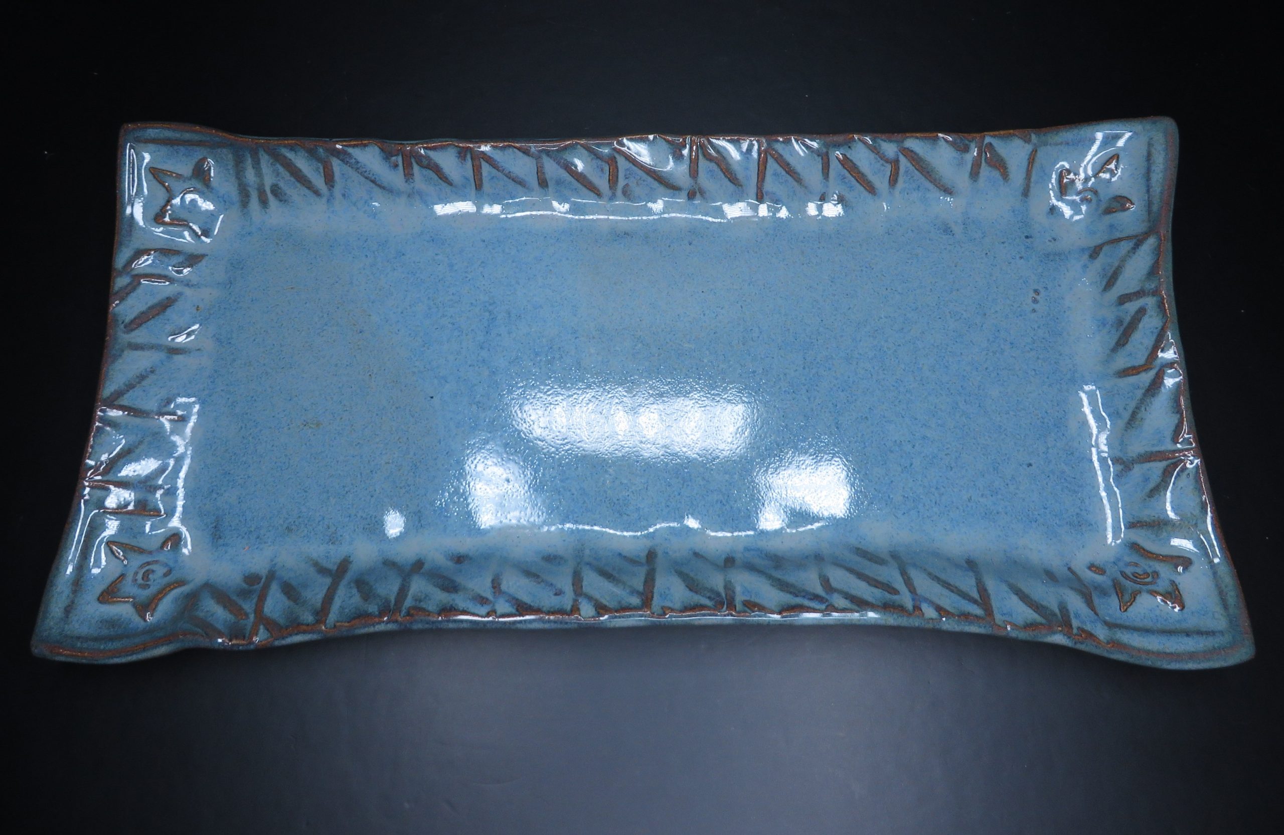 Swedish artist from Seagrove, North Carolina, Anne Jorgensen. This dish is beautiful with the details along the edge. The measurements are 11 inches long, 5 inches wide, and 1 inch tall.