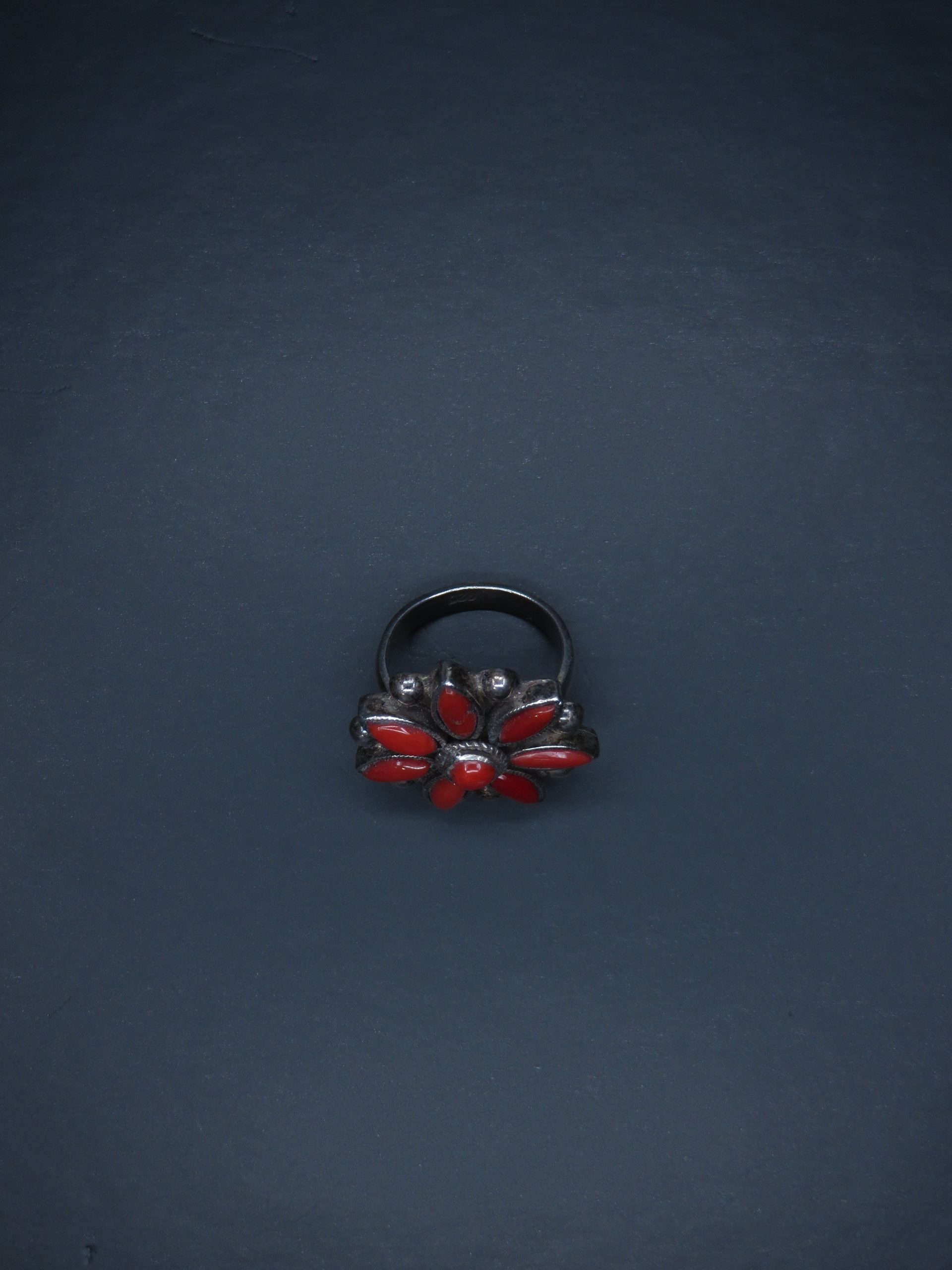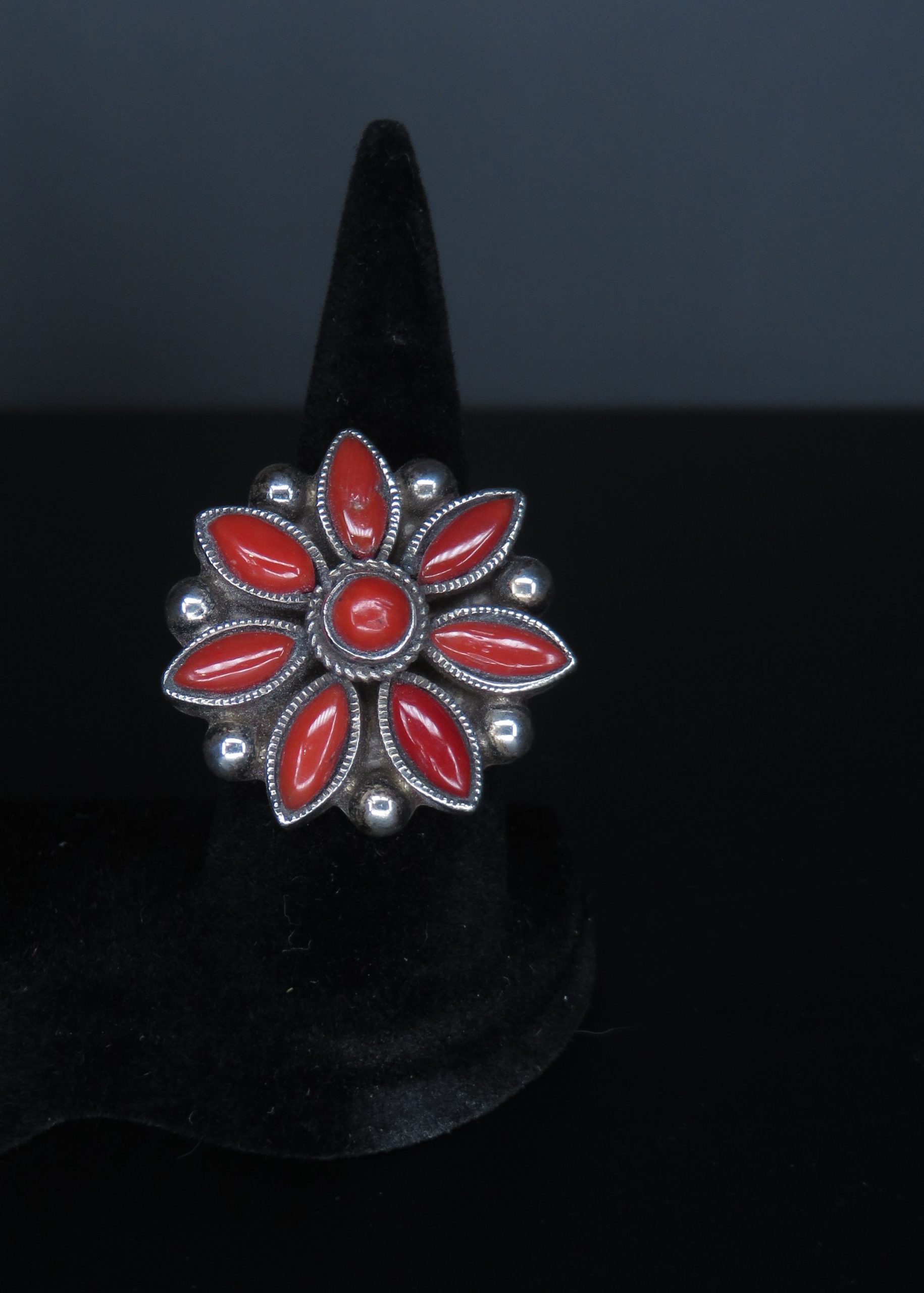 | Sterling silver coral stone flower ring. |