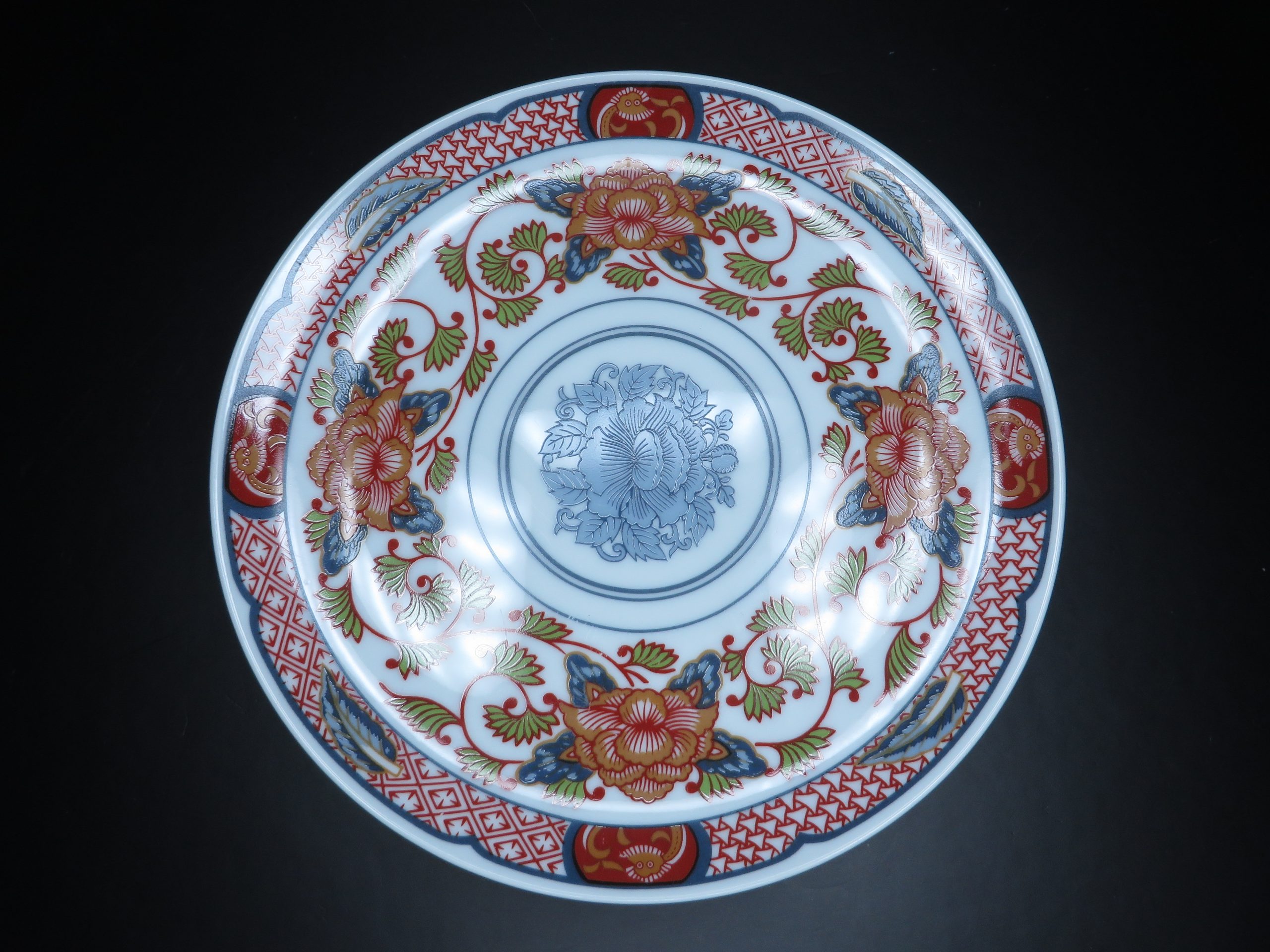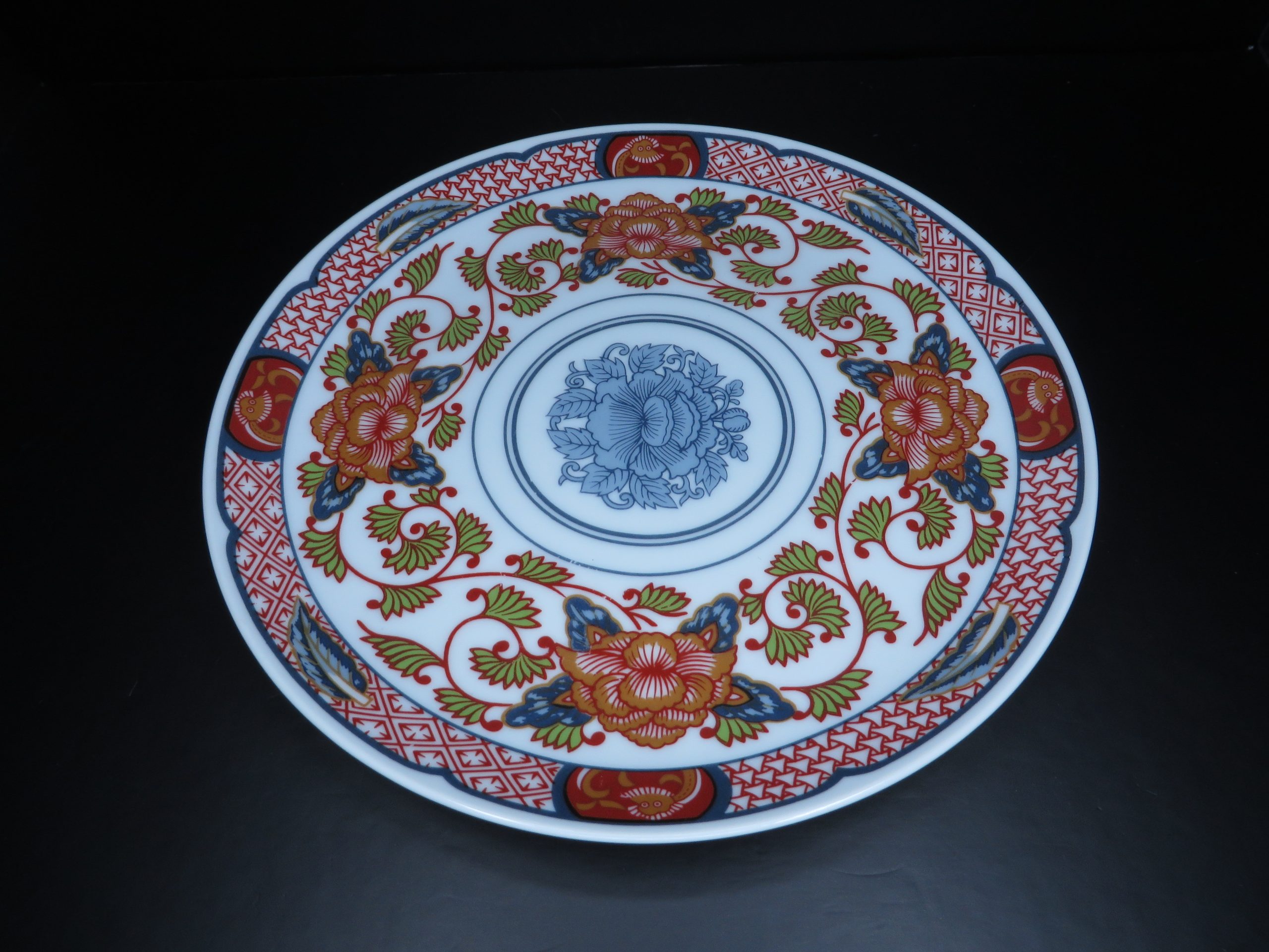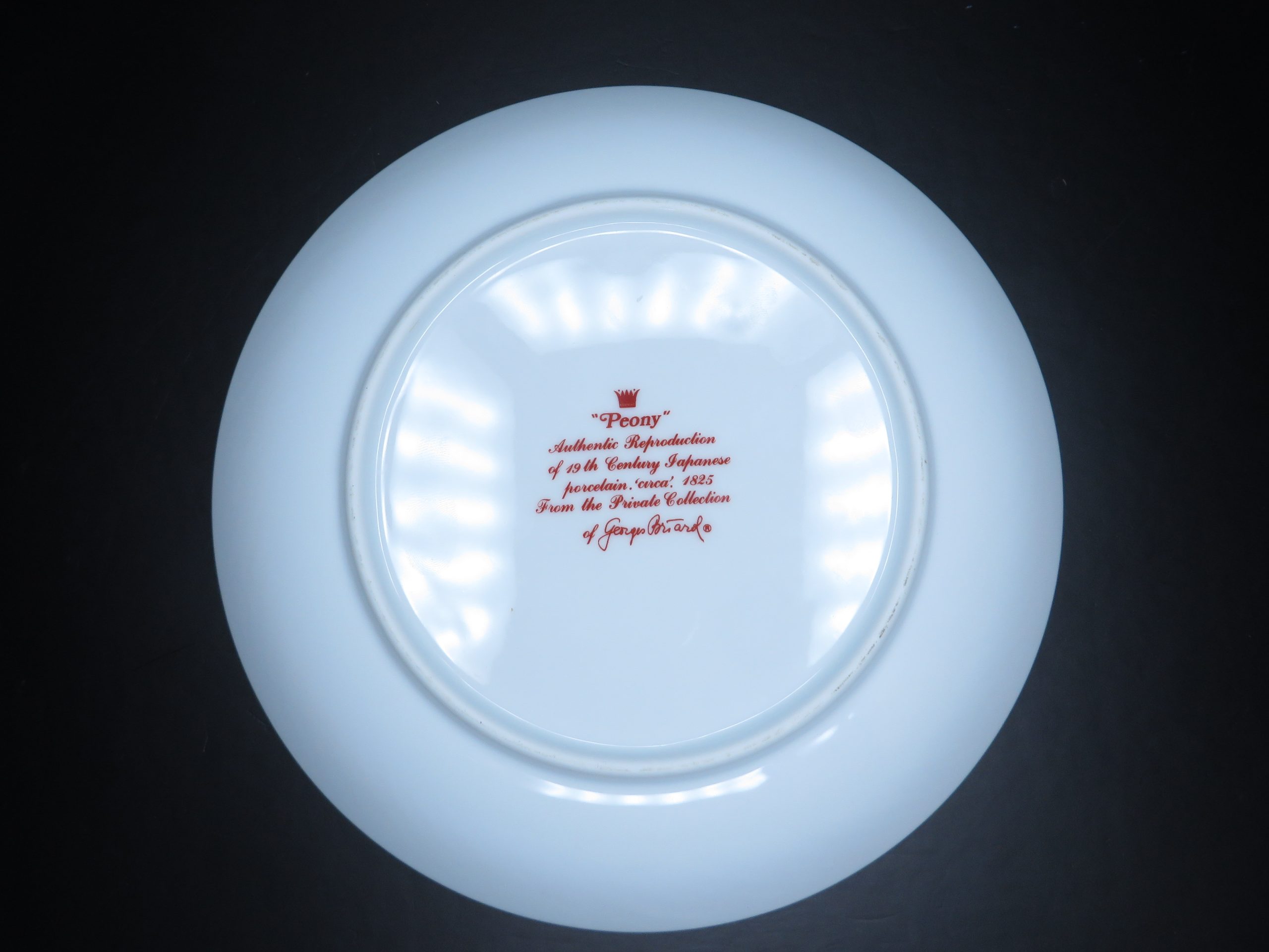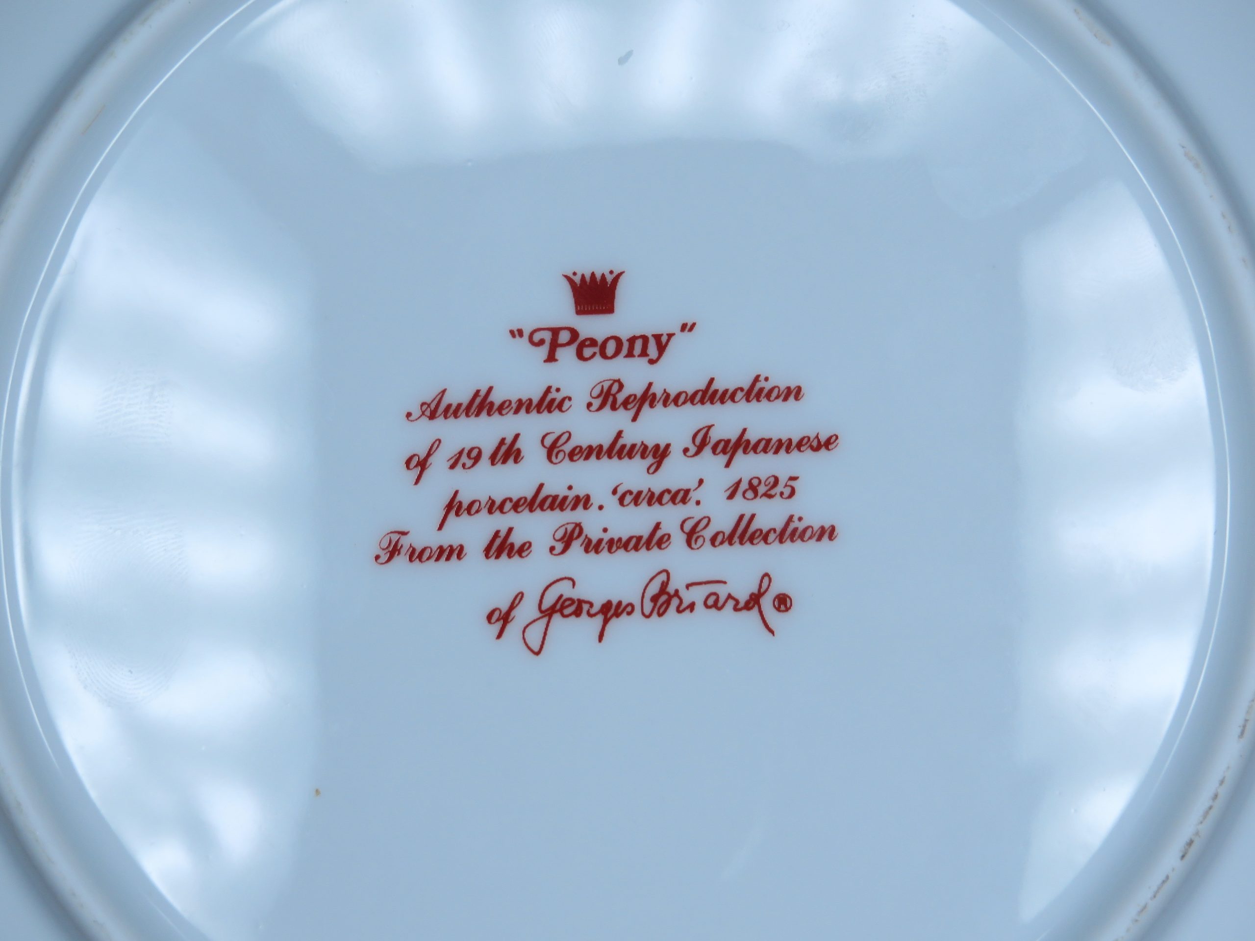 “‘Peony’ Authentic Reproduction of 19th Century Japanese porcelain. ‘circa’. 1825. From the Private Collection of Georges Briard”. This pattern features a distinctive color palette including rust, blues, and tan, accented with green leaves, depicting stylized flowers and vines. 7½ inches in diameter.