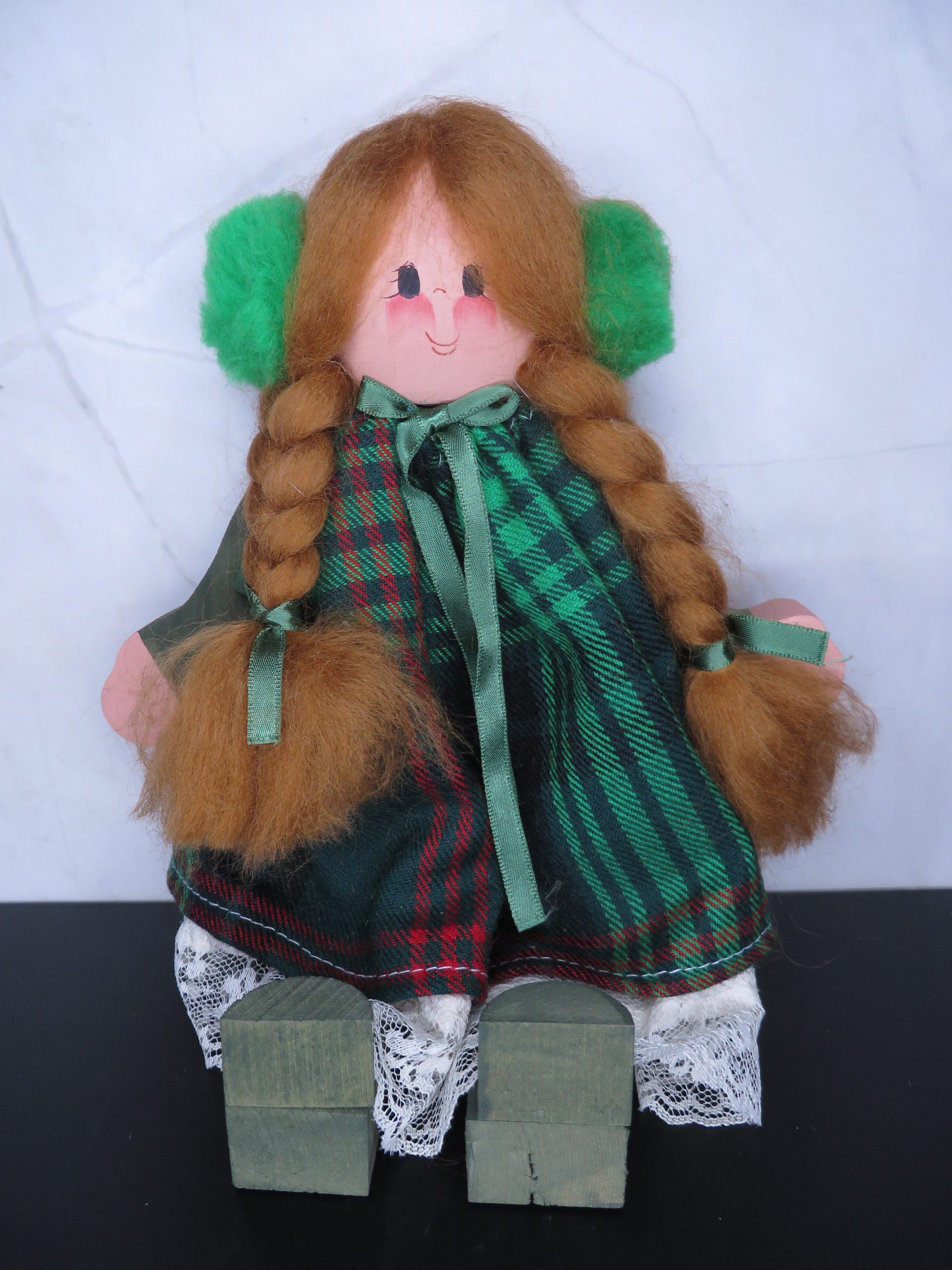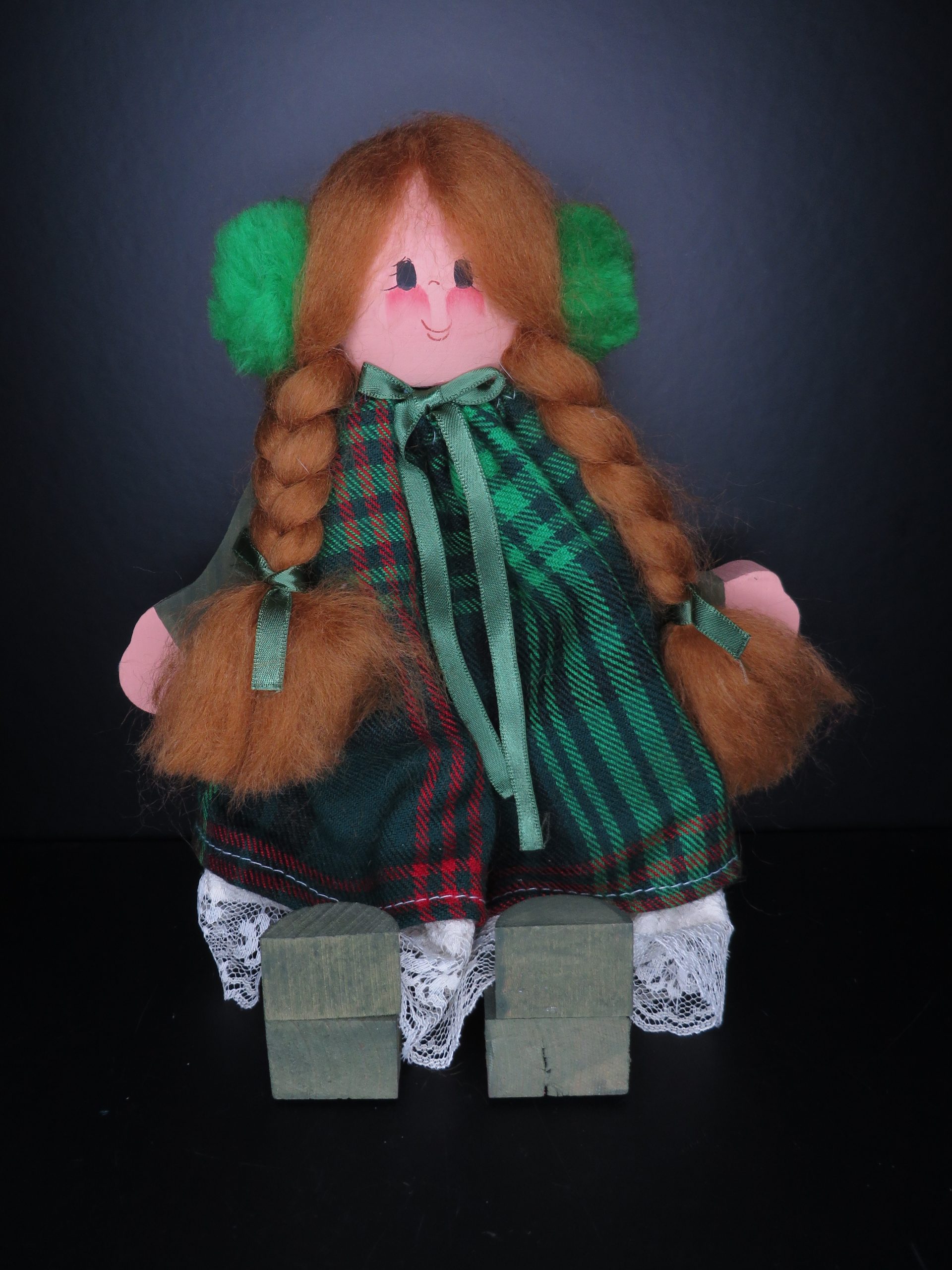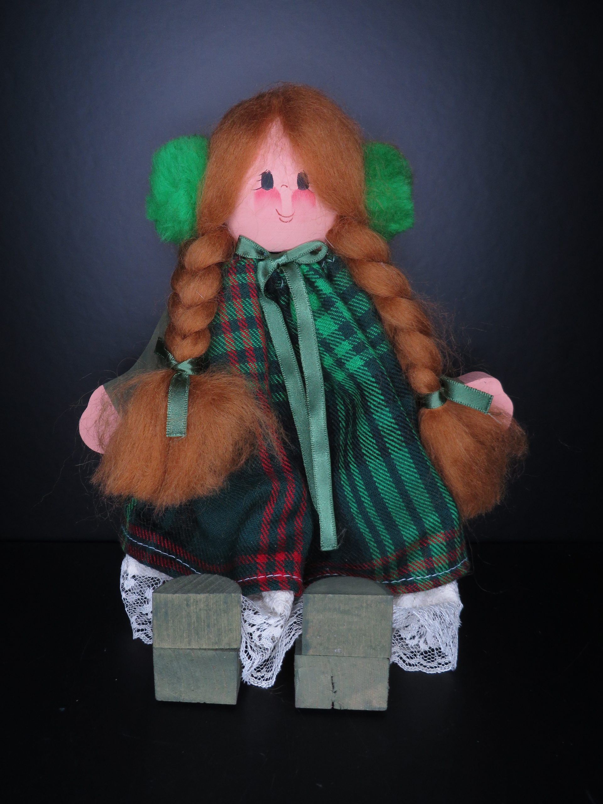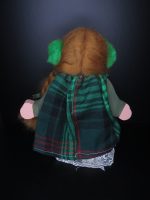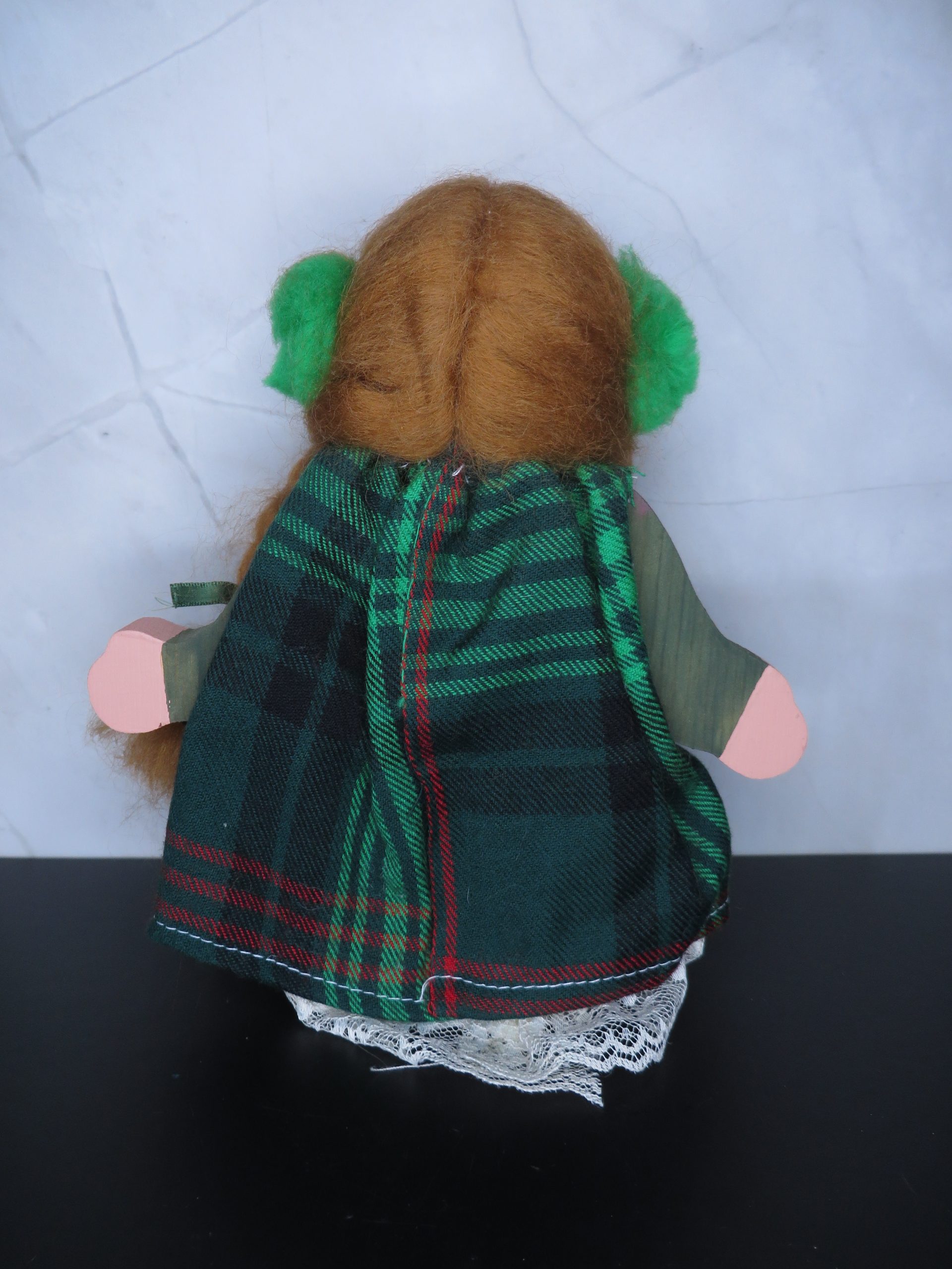 She is in a green and red plaid dress with green ear muffs and orange hair. 8 inches tall, 3½ inches wide.