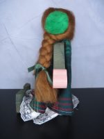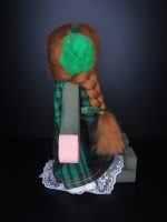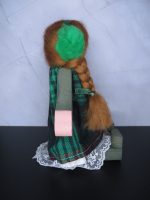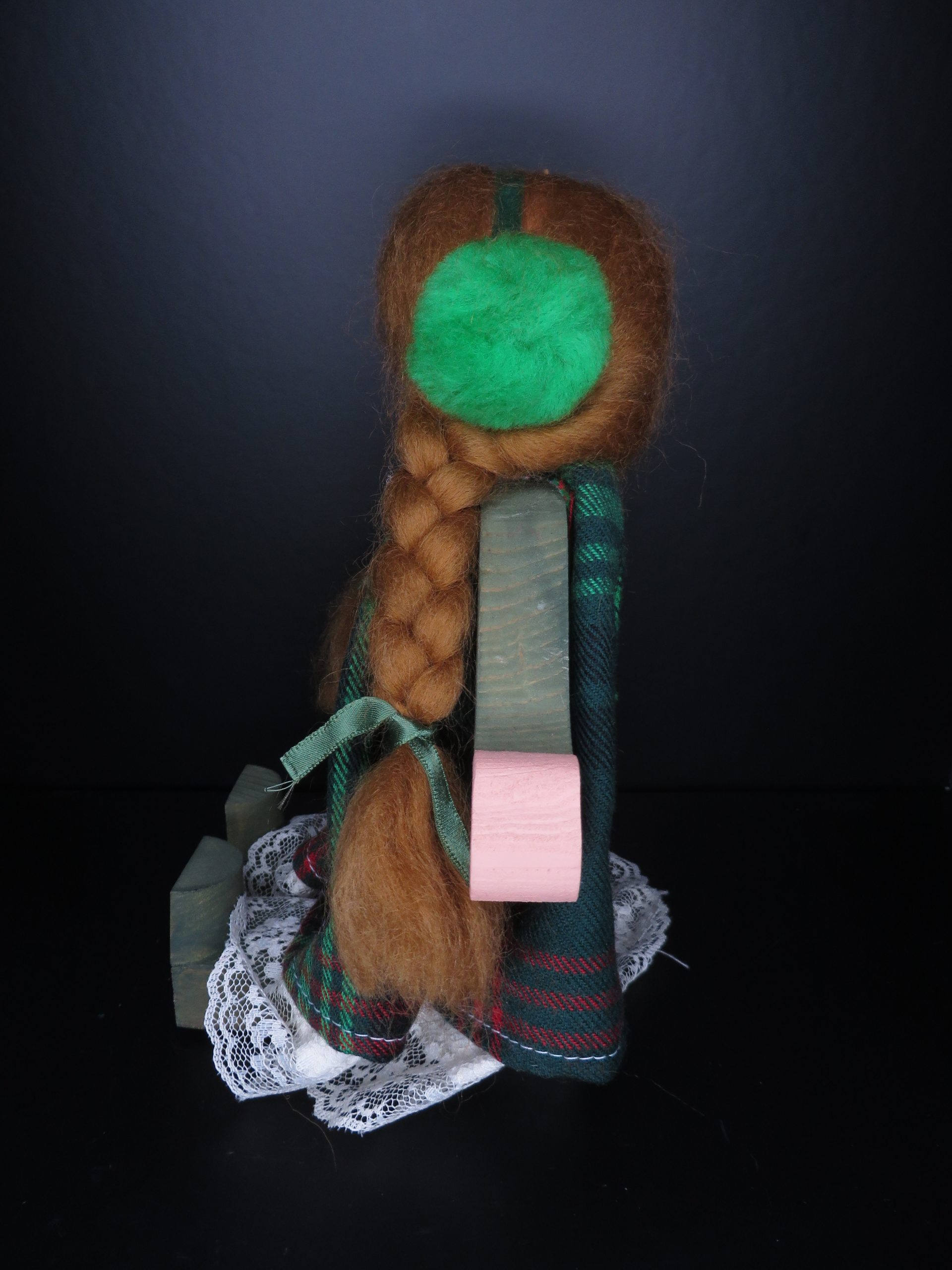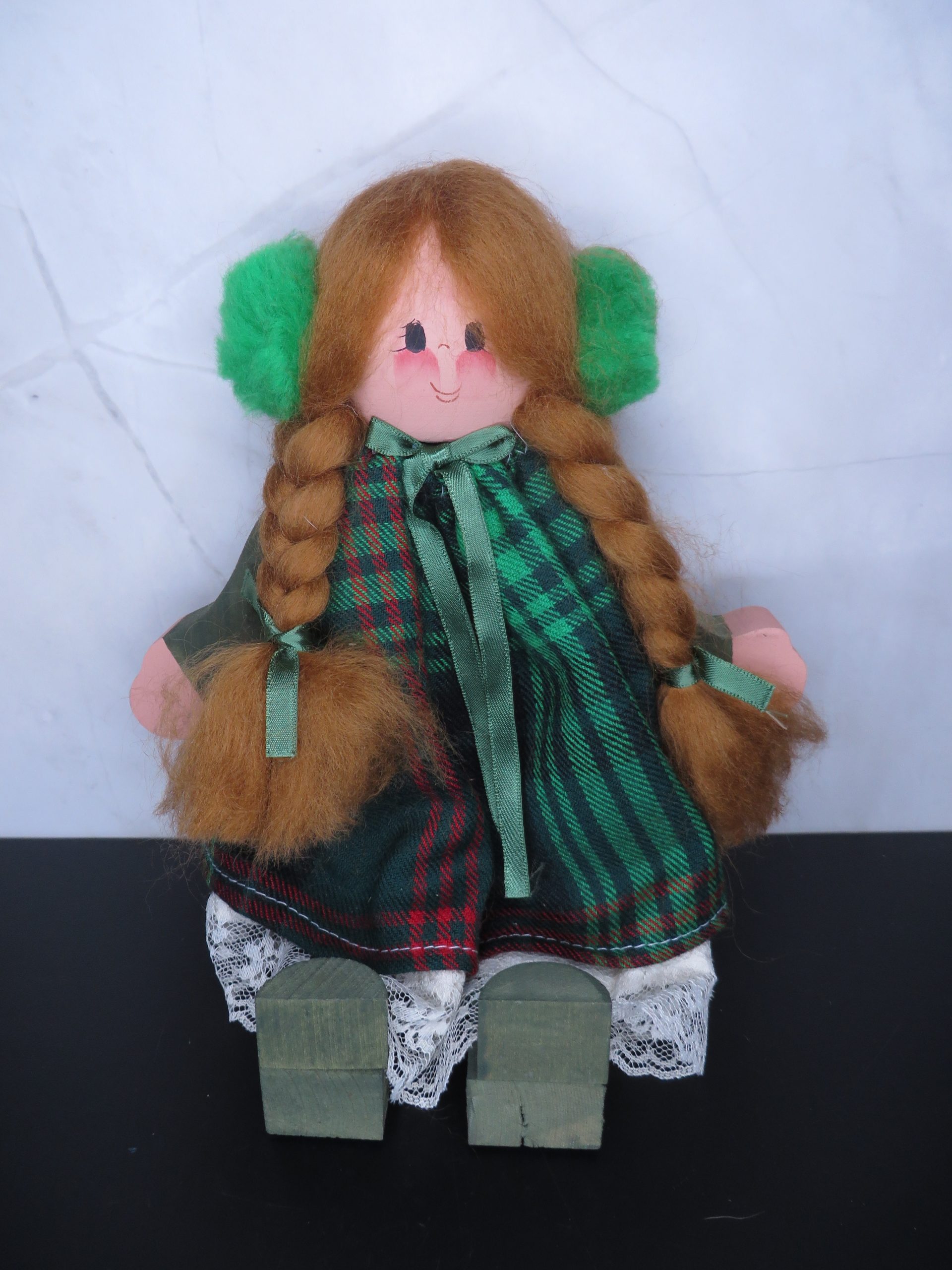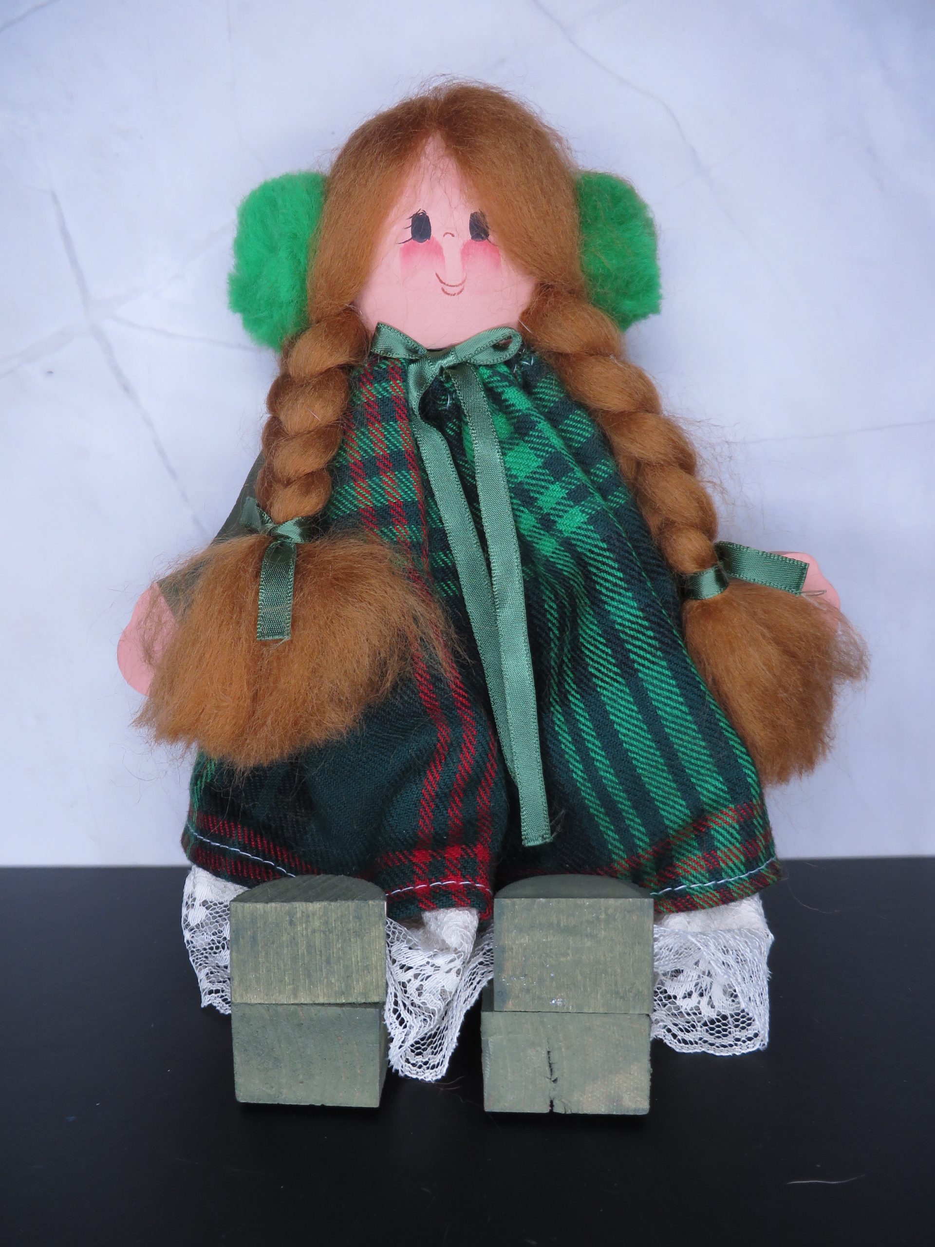 She is in a green and red plaid dress with green ear muffs and orange hair. 8 inches tall, 3½ inches wide.